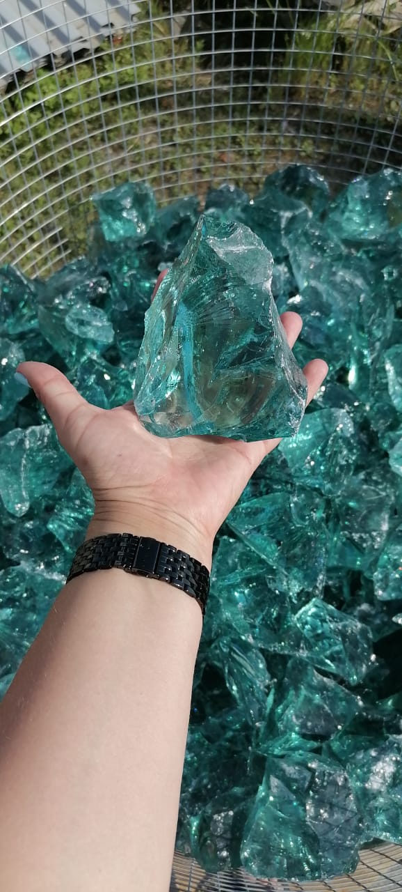 Большие куски цветного стекла используют в качестве отдельных элементов ландшафтного дизайна или внутри стильных помещений. Чтобы валуны выгодно подчеркивали задумку автора, их подсвечивают с помощью направленных источников света или устанавливают поверх встроенного в землю светодиодного уличного светильника.